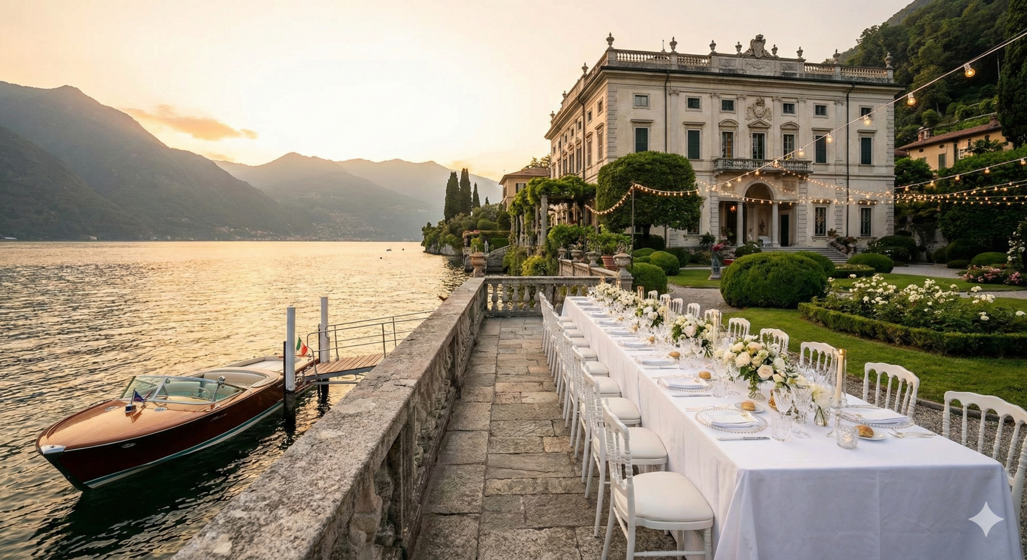 Photographer’s Insight: The "Darsena" (old boathouse) is a massive stone terrace right on the water. It is huge and perfect for a single long Imperial table under fairy lights.